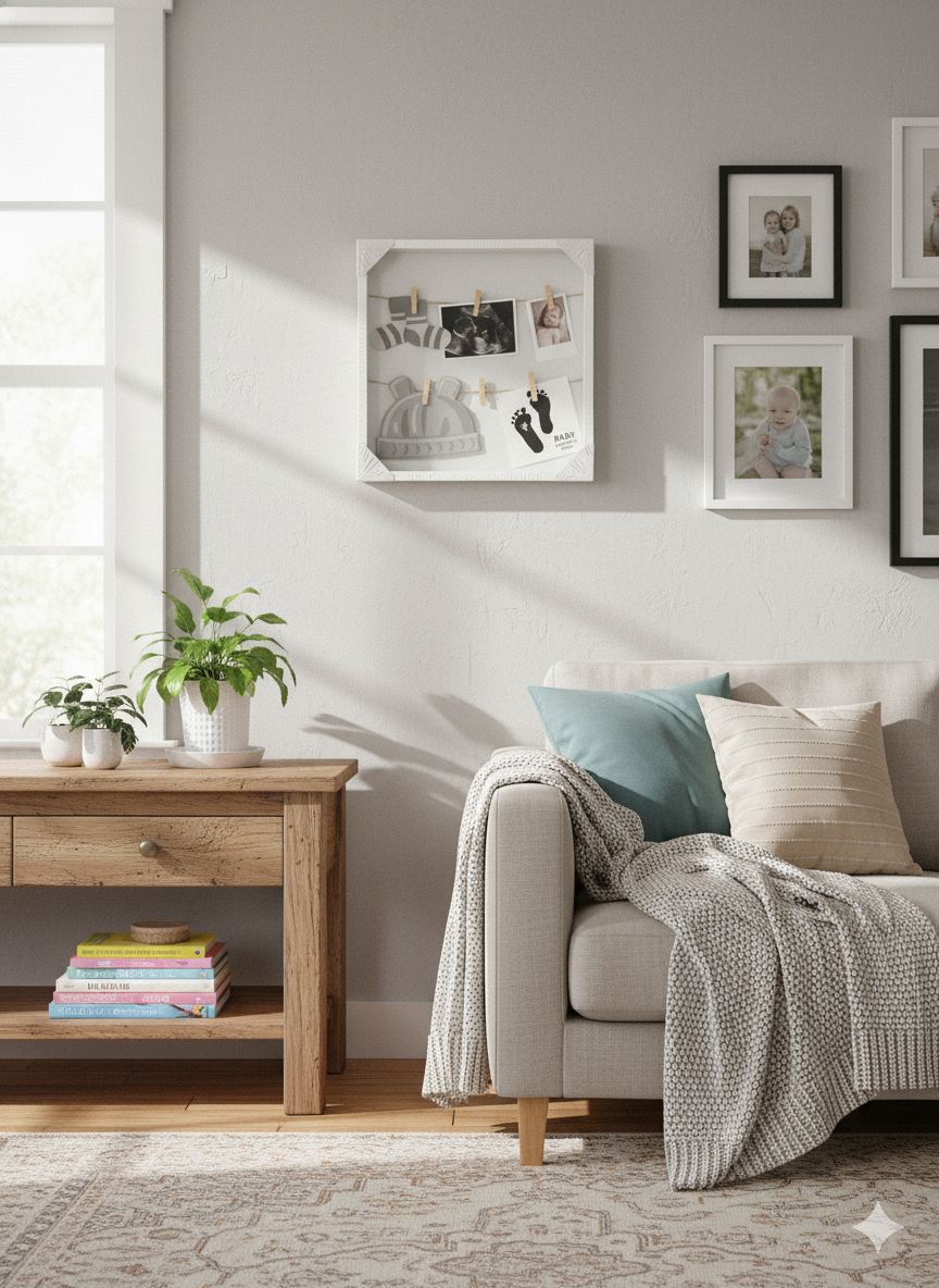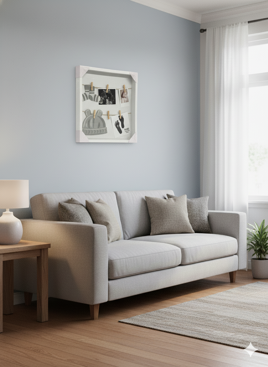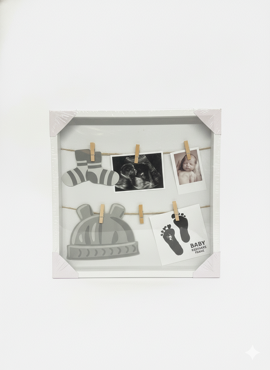 Prekrasan dekorativni okvir za slike, idealan za čuvanje najdražih uspomena! Okvir sadrži špagu sa kvačicama na koju možete objesiti ultrazvuk, fotografije i druge posebne trenutke, uz slatke ilustracije bebi dodataka. Savršen je kao poklon budućim roditeljima ili kao dekoracija u dječjoj sobi.